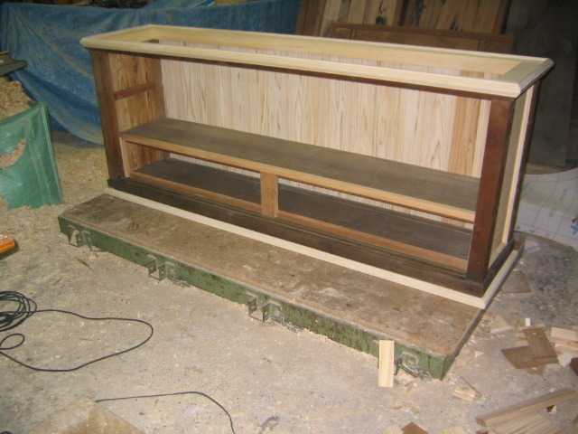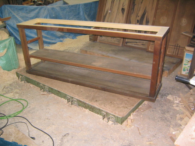 旅館平源さんで使われていた何かの収納ケースでしたが貴重な材料が使われていたので骨組みを残し作り変えました。平源さんの歴史を紹介する展示資料ケースになります。